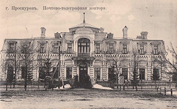Почтовые и телеграфные учреждения были объединены в 1885 году. Соответственно были созданы почтово-телеграфные конторы, действовавшие в городах. Такие конторы функционировали в Черном Острове, Ярмолинцах, Проскурове. Первоначально почтово-телеграфная контора была расположена на улице Каменецкой (близ современного подземного перехода). Но в 1870 году в Проскурове проложили железную дорогу и почту перенесли на Миллионную улицу (Героев Майдана). Однако здание было старым и его в начале прошлого века снесли. Вместо этого построили новый дом.