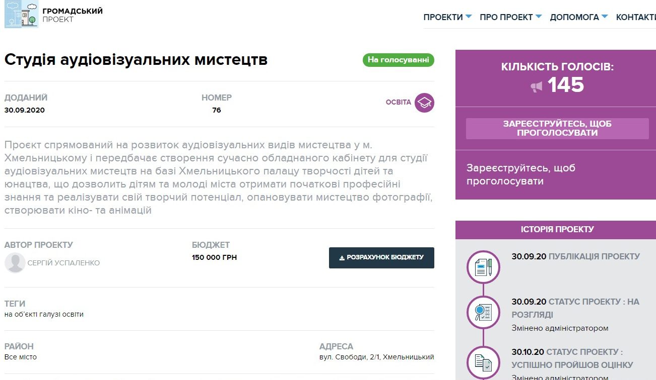 Мы уже не раз напоминали, что в Хмельницком продолжается голосование за проекты «Бюджет участия». Одна из идей, представленных в сфере образования, касается создания в Хмельницком Студии аудиовизуальных искусств. Этот проект зарегистрирован под номером 76. По состоянию на сегодня, 20 ноября, он получил 145 голосов. Хмельничане могут отдать свой голос за эту идею по 30 ноября. Автор идеи — Сергей Успаленко.