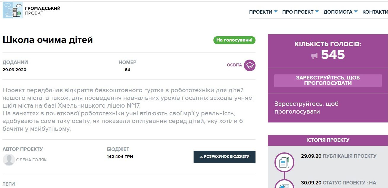 Один из проектов, представленных в сфере образования, называется «Школа глазами детей» и касается создания на базе Хмельницкого лицея №17 кружка по робототехнике. Его смогут бесплатно посещать хмельницкие школьники. Проект зарегистрирован под номером 64. Идея получила 545 голосов.
