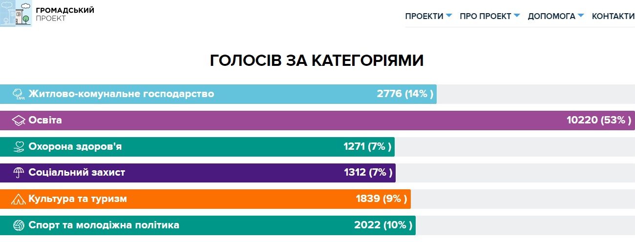 Напомним, что хмельничане могут поддержать 5 проектов из 67 отобранных на голосование. На сегодня, 25 ноября, наибольшее количество голосов получила сфера образования, а именно 10220. На втором месте сфера жилищно-коммунального хозяйства (2776 голосов). Третью строчку занимает спорт и молодежная политика (2022 голоса). Проекты, представленные в сфере культуры и туризма, получили пока 1839 голосов. Сфера социальной защиты — 1312 голосов. Идеи в сфере здравоохранения получили 1271 голос.