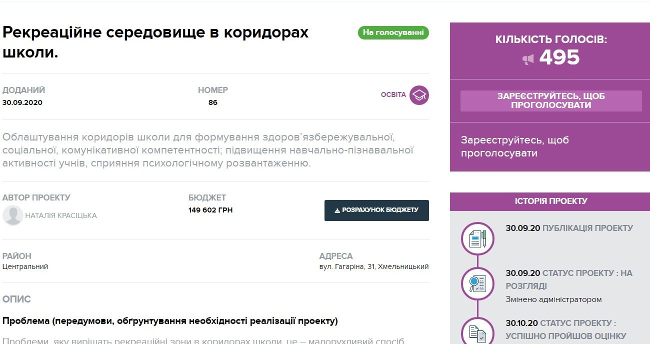 Директор школы №32 Наталья Красицкая обращается ко всем неравнодушным хмельничанам и просит поддержать проект по созданию рекреационной среды в коридорах учебного заведения. Этому проекту трудно соперничать с другими идеями, ведь в школе №32 учится небольшое количество учеников. Однако они требуют создания таких зон для отдыха, которые будут дарить уют, комфорт и способствовать полноценному отдыху во время перерывов.